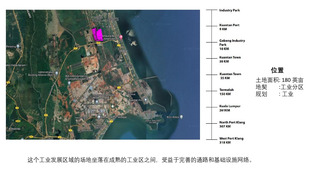 该土地面积约为180英亩,合728,434平方米,靠近关丹港、国际深水码头以及正在开发的工业园区。